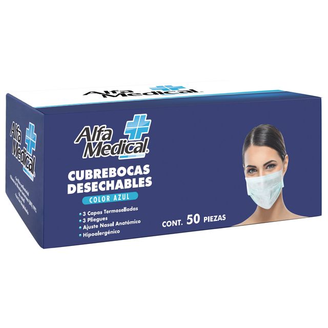 Los cubrebocas Alfa Medical® son termosellados con 3 capas (spundbond, meltblown, spundbond) y ajustador nasal.