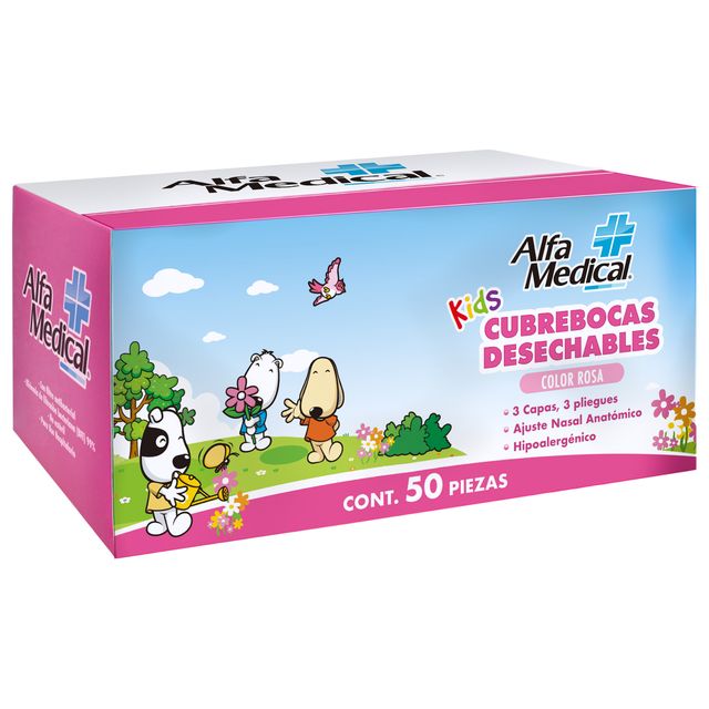 CUBREBOCAS DESECHABLES TRES CAPAS / KIDS / COLOR ROSA / 50 PZ